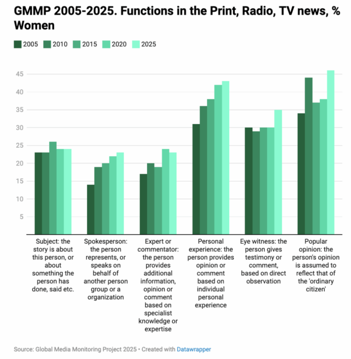 - La partecipazione delle donne come fonti continua a svolgersi principalmente in ruoli ordinari, come divulgatrici di opinioni popolari e intervistate che forniscono resoconti di testimoni oculari.