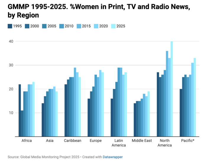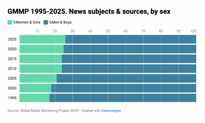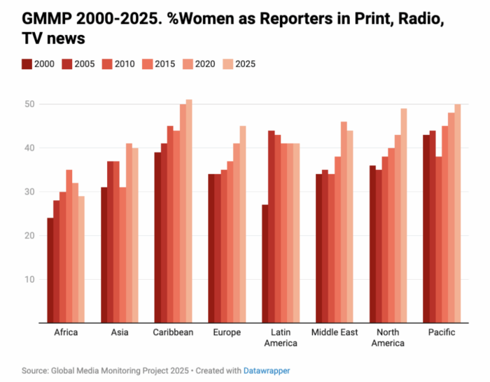 La Piattaforma di Pechino ha chiesto alle donne pari accesso all’espressione mediatica e al processo decisionale. Tre decenni dopo, il 41% dei giornalisti che scrivono articoli di cronaca tradizionale sono donne, un miglioramento rispetto al 28% del 1995, ma ancora non pari.