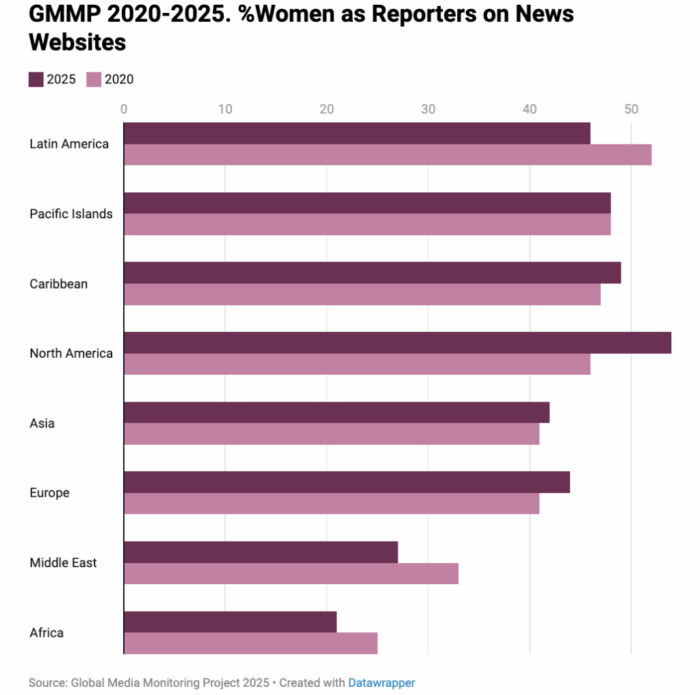 L’importanza di Internet per la diffusione delle notizie, che ha raggiunto il picco durante il periodo della pandemia, continua ancora oggi. Tuttavia, mentre la percentuale di giornaliste online è passata dal 25% nel 2015 al 42% nel 2020, nel 2025 è aumentata solo di un punto, raggiungendo il 43%.