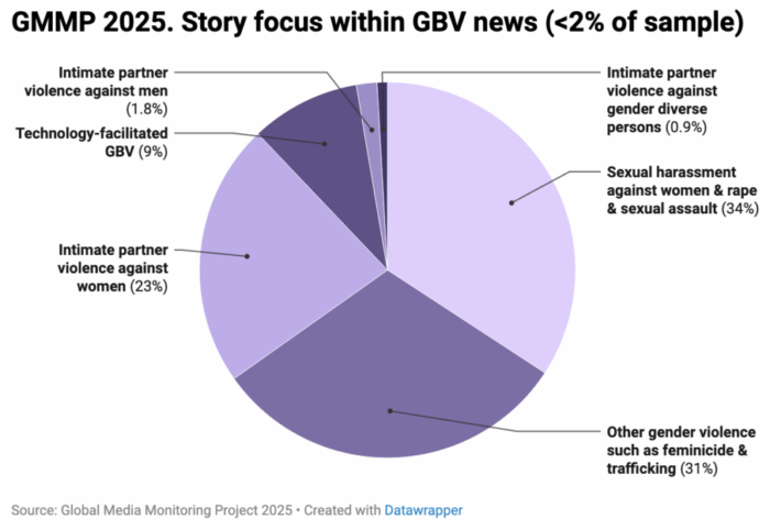 Le varie forme di violenza di genere (GBV) offline e online sono trattate in meno di due articoli su 100 in tutto il mondo. Di questi, meno del 2% si concentra sulla violenza di genere contro gli uomini. (Figura 6)