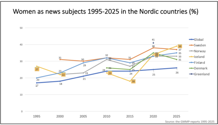 L’analisi in dettaglio dei paesi del Nord Europa si allinea su questa inerzia: nessun Paese nordico tranne la Groenlandia, supera stabilmente fino ad oggi la soglia del 40% di presenze femminili nelle notizie. Così in Islanda, dove si registra un 38% di presenze femminili nei media, nonostante l’importante spazio femminile nelle posizioni pubbliche e politiche, le donne continuano a essere poco presenti nei settori economici e finanziari. Il mercato del lavoro è ancora bloccato e i risultati mostrano che la rappresentanza formale non basta a garantire equilibrio nei media. Nel tempo, l’Islanda ha celebrato i buoni risultati nel Global Gender Gap, ma ha trascurato gli indicatori meno positivi.